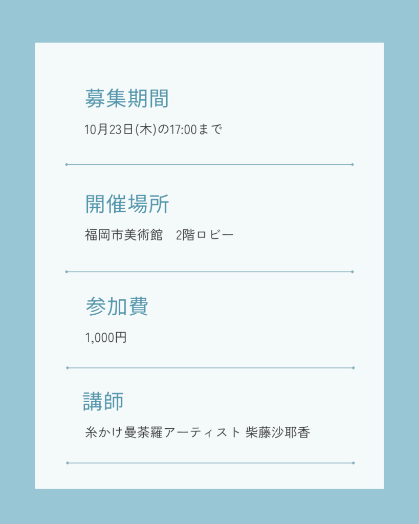 福岡市中央区にある「福岡市美術館」で糸かけ曼荼羅のワークショップを開催させていただくことになりました。